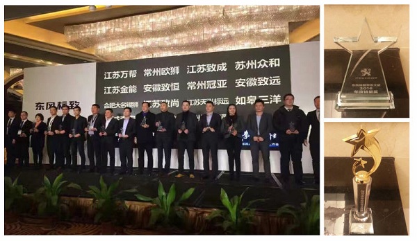 革故鼎新 獅鑄輝煌——2017東風(fēng)標(biāo)致華東大區(qū)工作會(huì)于1月12日在江蘇常州召開,會(huì)上東風(fēng)標(biāo)致大區(qū)評(píng)選出了2016年度優(yōu)秀經(jīng)銷商及為公司發(fā)展做出杰出貢獻(xiàn)的優(yōu)秀個(gè)人。其中江蘇天泓標(biāo)遠(yuǎn)榮獲了兩項(xiàng)榮譽(yù)獎(jiǎng)項(xiàng),分別是;