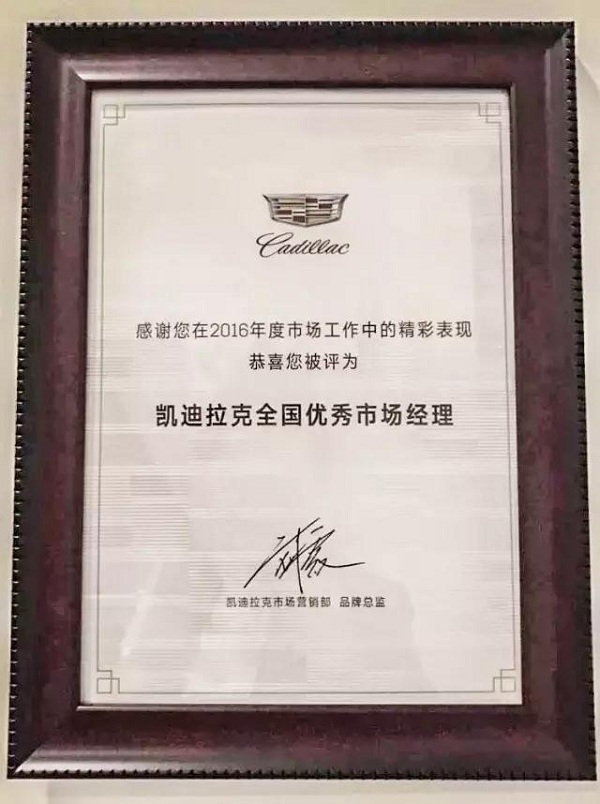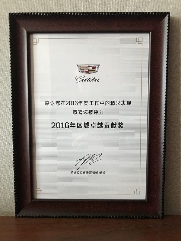 天泓凱帝2006年開業(yè),作為南京首家凱迪拉克4S店,新車銷量歷年來保持南京地區(qū)第一,2016年更是單店銷量排名全國第二。為表彰天泓凱帝10年間持續(xù)的優(yōu)異表現(xiàn)及在經(jīng)營業(yè)績上對于區(qū)域市場的突出貢獻(xiàn),此次年會上更是獲頒“區(qū)域卓越貢獻(xiàn)獎”,這一獎項是凱迪拉克首次設(shè)立的給予單一經(jīng)銷商的最高榮譽,天泓凱帝也是目前唯一獲頒此獎的優(yōu)秀授權(quán)經(jīng)銷商。
