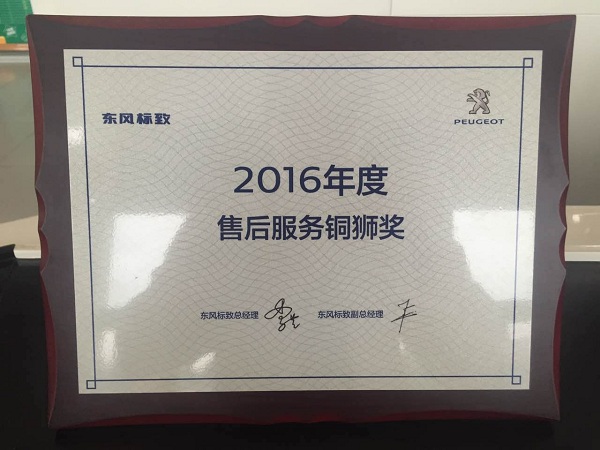2016年是不平凡的一年,在這一年里新車銷售市場低迷,經(jīng)銷商經(jīng)營愈加困難,天泓標(biāo)遠(yuǎn)以頑強(qiáng)的拼搏精神迎難而上,在售后服務(wù)中想辦法、尋突破,在2016年取得了較好的成績,獲得了東風(fēng)標(biāo)致的認(rèn)可和支持,榮獲——東風(fēng)標(biāo)致2016年度售后服務(wù)銅獅獎