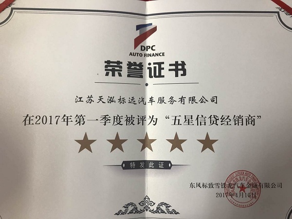 金融信貸業(yè)務(wù)一直是天泓標(biāo)遠(yuǎn)的重點業(yè)務(wù)板塊,在2017年金融政策的引導(dǎo)下,在天泓標(biāo)遠(yuǎn)銷售團(tuán)隊的共同努力下,取得了良好的成績,被東風(fēng)標(biāo)致雪鐵龍汽車金融有限公司授予了——“五星信貸經(jīng)銷商”的最高獎項,這個獎項是對天泓標(biāo)遠(yuǎn)在金融業(yè)務(wù)板塊所付出努力的肯定。